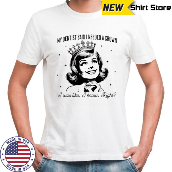 Don’t miss out on the opportunity to own a piece that not only elevates your fashion game but also uplifts your spirits. Get your hands on the Girl my dentist said I needed a crown I was like I know right shirt today and let your style reflect your inner royalty. Wear it with pride, share a laugh, and make every moment a memorable one with this fun and fashionable addition to your closet.